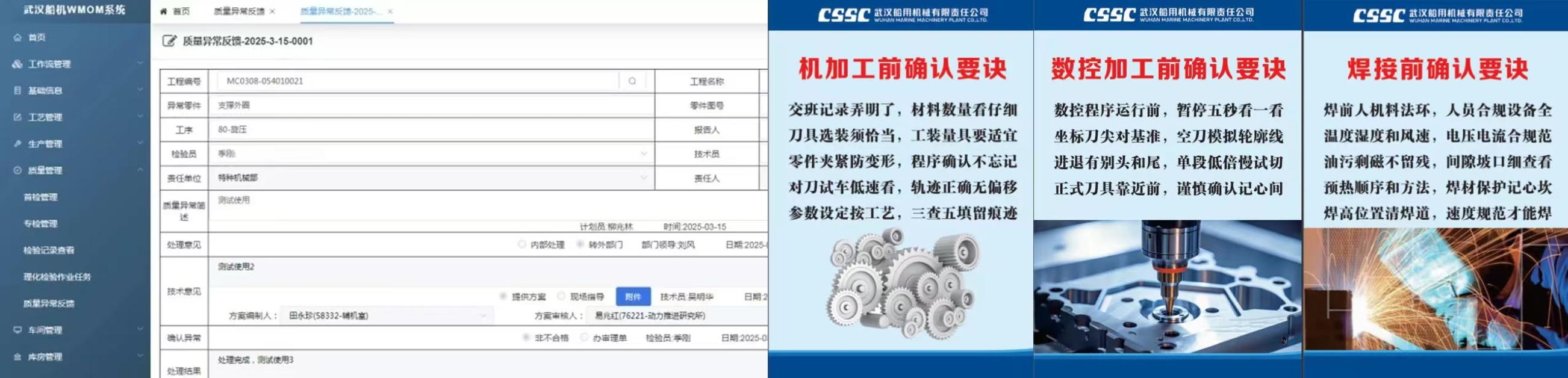 為進(jìn)一步提升生產(chǎn)管控水平,中船集團武漢船機總結(jié)質(zhì)量管理好的經(jīng)驗做法,以操作者為中心,探索新的管控手段,利用信息管理系統(tǒng)賦能,基于WMOM系統(tǒng)推出“確認(rèn)制、舉手制、推送制”功能。