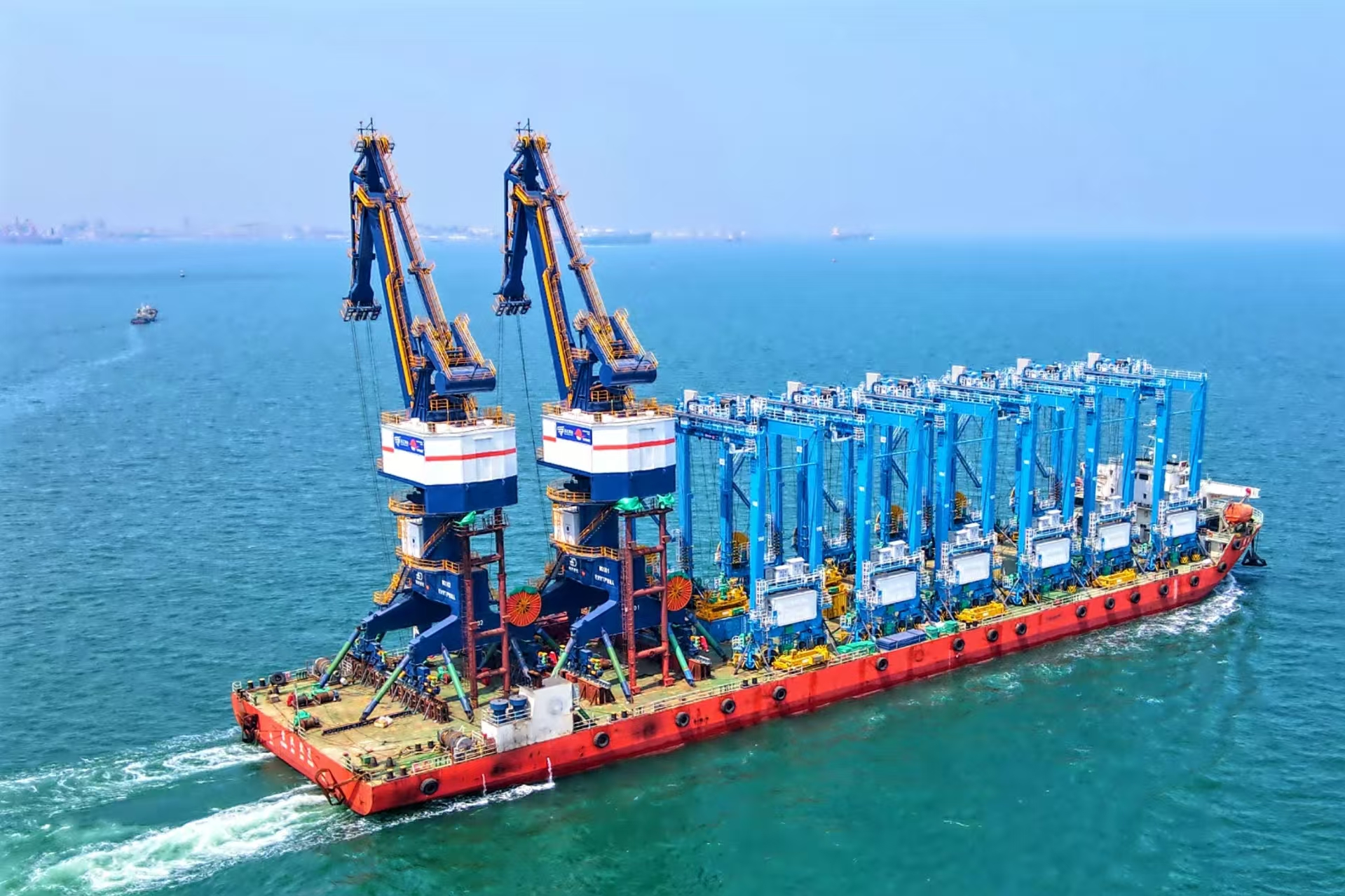 該批門(mén)機(jī)配有吊鉤、抓斗、集裝箱吊具,用于件雜貨作業(yè)以及集裝箱、抓斗作業(yè),可滿足5萬(wàn)噸級(jí)貨船的裝卸需求,將與前期武漢船機(jī)海西重機(jī)為其打造的批量岸橋協(xié)同作業(yè)。